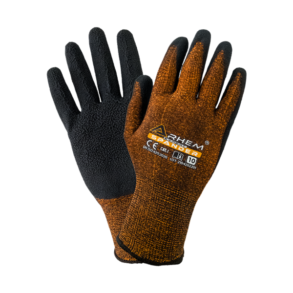 Rękawice ochronne wykonane z poliestrowej dzianiny połączonej ze spandexem w kolorze brązowym, powlekane czarnym lateksem o piankowej strukturze
