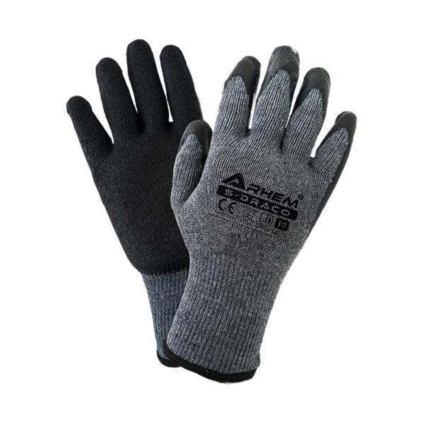 Rękawice ochronne wykonane z bawełnianej dzianiny w kolorze szarym, powlekane czarnym lateksem o porowatej strukturze.