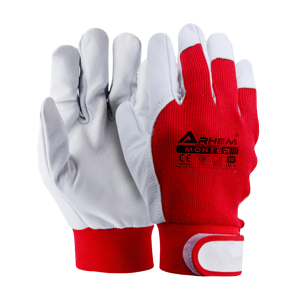 Rękawice skórzano-tkaninowe z dzianiny bawełnianej wzmacniane kozią skórą licowaną.