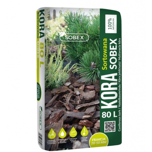 Kora sortowana SOBEX o frakcji 20‑50mm to naturalna kora ogrodowa sortowana pochodzenia iglastego w frakcji 20–50 mm, idealna do ogrodu jako ściółka i dekoracja rabat. Kora jest oczyszczona z piasku i pyłu oraz przygotowana do stosowania wokół krzewów, drzew i kwiatów, pomagając utrzymać wilgoć w glebie, ograniczyć wzrost chwastów i stabilizować temperaturę podłoża, co wspiera zdrowy wzrost roślin.
