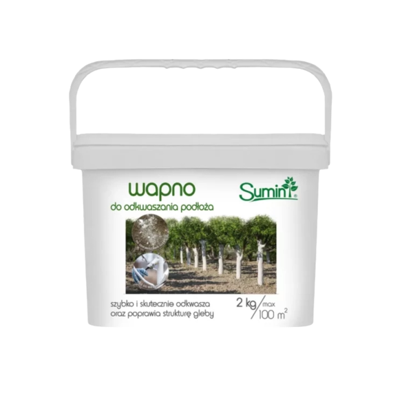 Wapno do odkwaszania podłoża Sumin to produkt do regulacji pH gleby, który służy do odkwaszania podłoża przed siewem lub sadzeniem roślin oraz po zbiorze plonów, co ułatwia roślinom lepsze pobieranie składników odżywczych z gleby i poprawia jej strukturę. Produkt może być stosowany także do bielenia pni drzew i krzewów, co zmniejsza ryzyko pękania kory i oparzeliny mrozowej oraz utrudnia szkodnikom wspinanie się po korze.